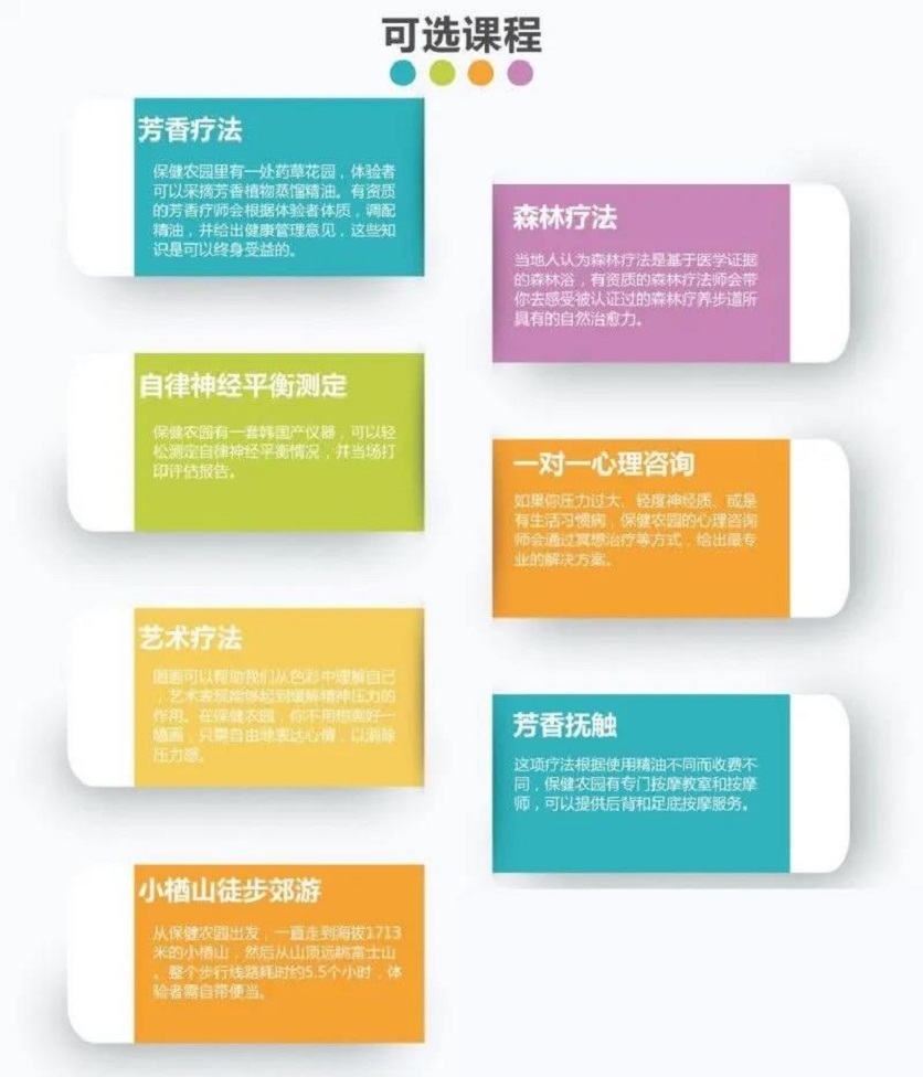 套餐課程:適用于所有到訪游客,根據住宿時間長短,基地會提供相應的健康管理課程,包括“坐禪、喚醒瑜伽、圍爐夜讀、健身球放松活動”等,套餐課程一般安排在早晚進行:早晨是心理調節課程、晚上是生理調節課程,時長基本為一小時左右(圍爐夜讀課程為兩小時)。